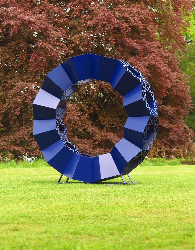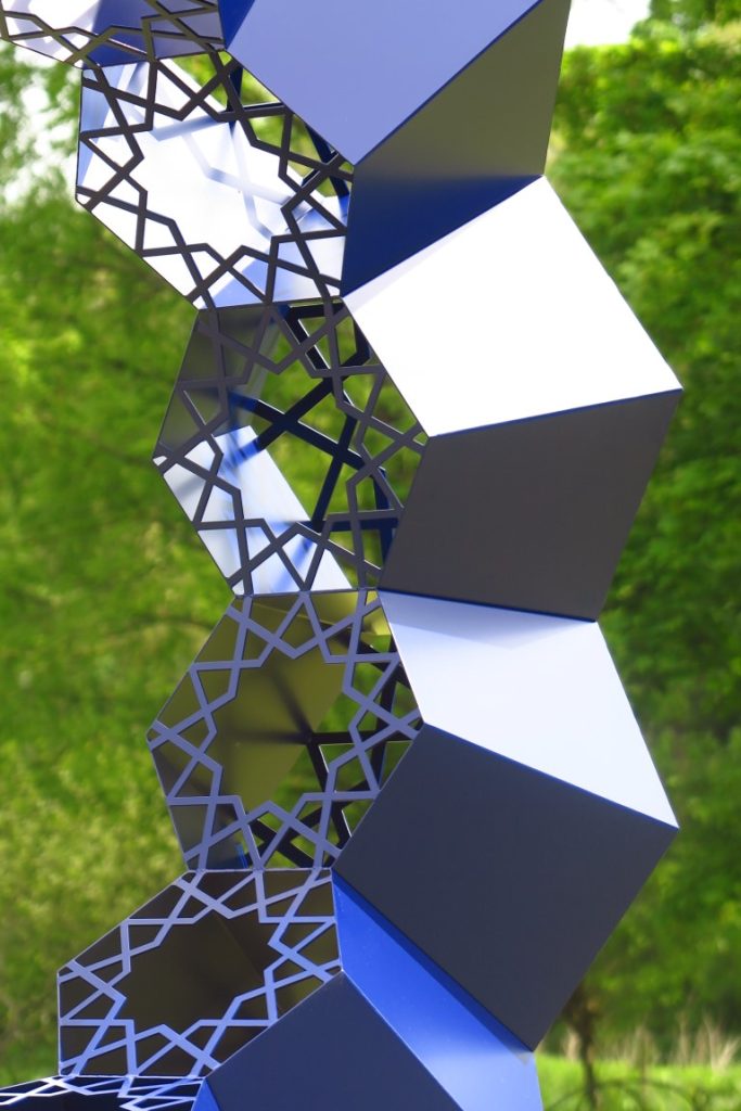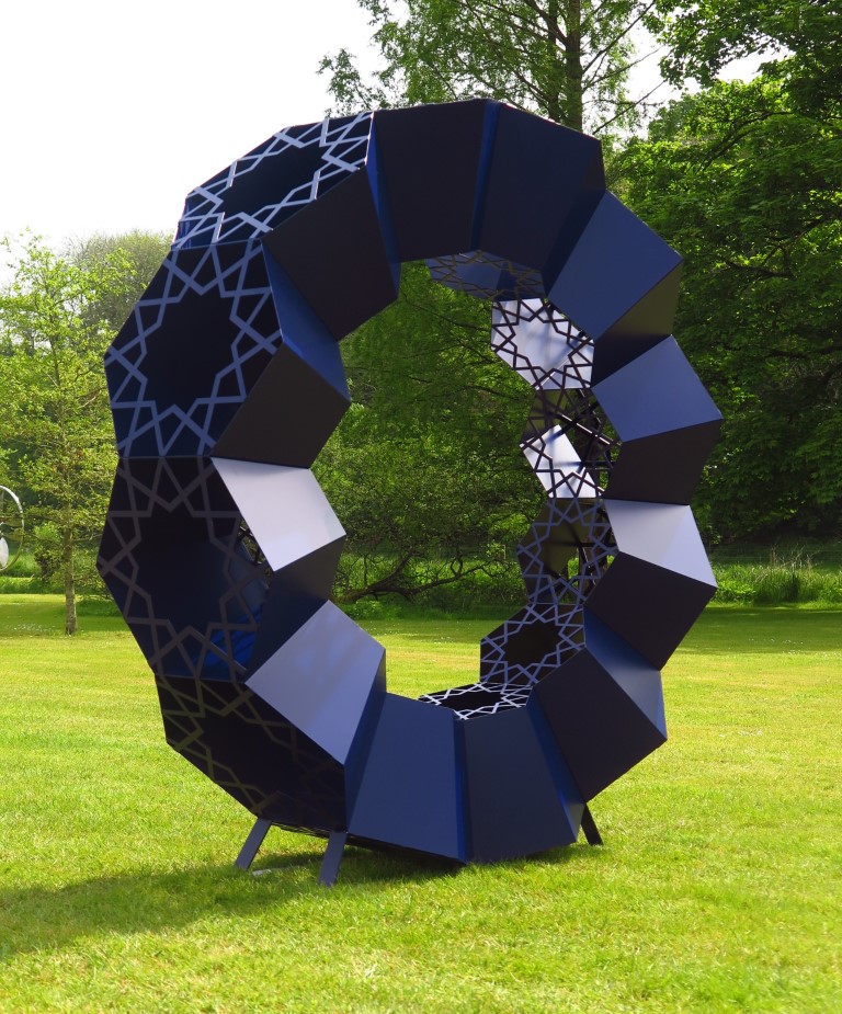 The colour is widely incorporated within the tiling found in the Mosque – a colour that is equally effective in a built environment and as within nature. As the daylight light catches the sculpture it can also be seen that there is not one blue – but a spectrum of shades fall on the flanges, and this changes continually at different time of day or year. This sculpture is from Moorhouse’s Matahatan Series: The symmetries of space and the spectacle of geometry: Harmony, balance, beauty, and proportion.