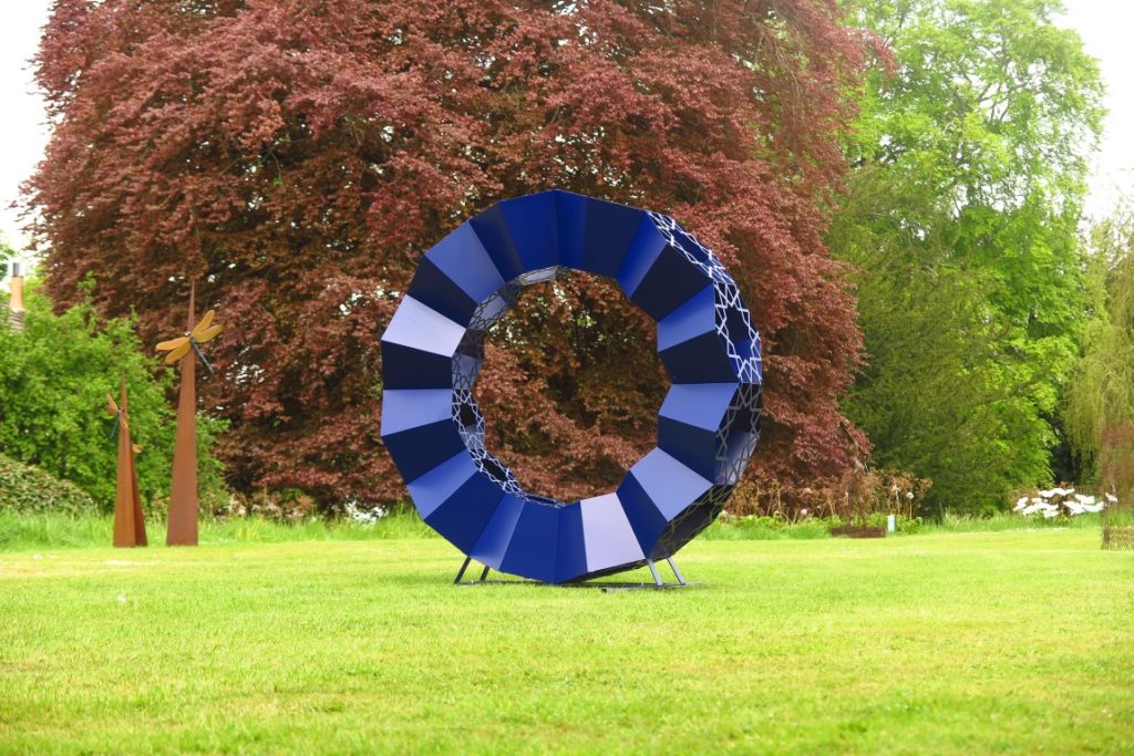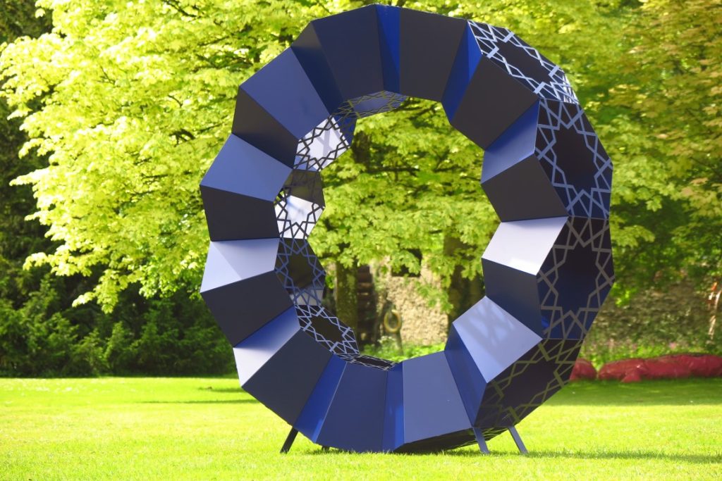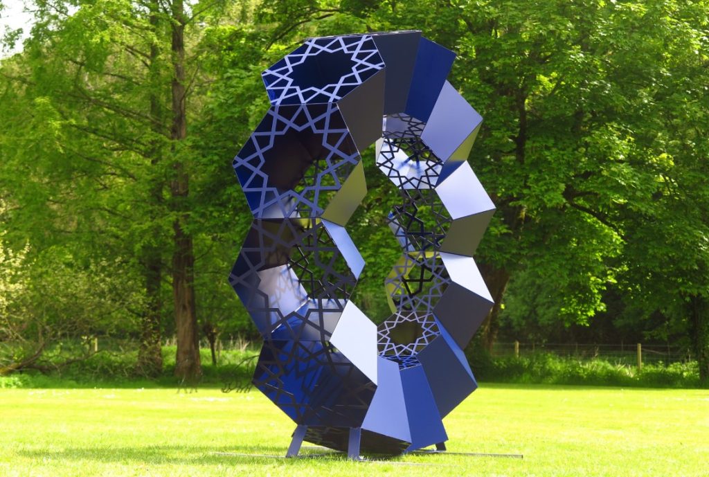 This sculpture creates a three-dimensional representation based on this origin motif seeking to retain a sense of balance, symmetry and harmony. The lattice patterns become circular – representing the infinite repetition, the hexagonal form that originally informed the motif, informs the wider sculptural form.
