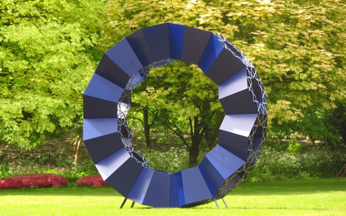 The colour is widely incorporated within the tiling found in the Mosque – a colour that is equally effective in a built environment and as within nature. As the daylight light catches the sculpture it can also be seen that there is not one blue – but a spectrum of shades fall on the flanges, and this changes continually at different time of day or year. This sculpture is from Moorhouse’s Matahatan Series: The symmetries of space and the spectacle of geometry: Harmony, balance, beauty, and proportion.