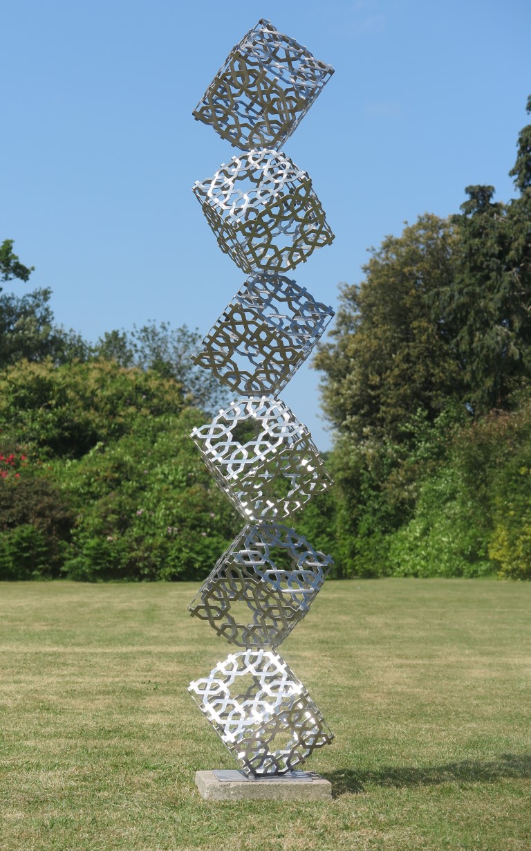 This sculpture reinterprets traditional Islamic geometric design in contemporary sculptural form. The geometric patterns in Islamic art were generally two dimensional (tiles, mosaics, engraving etc) or architectural. This work explores how these designs could be represented three dimensionally as a sculpture.